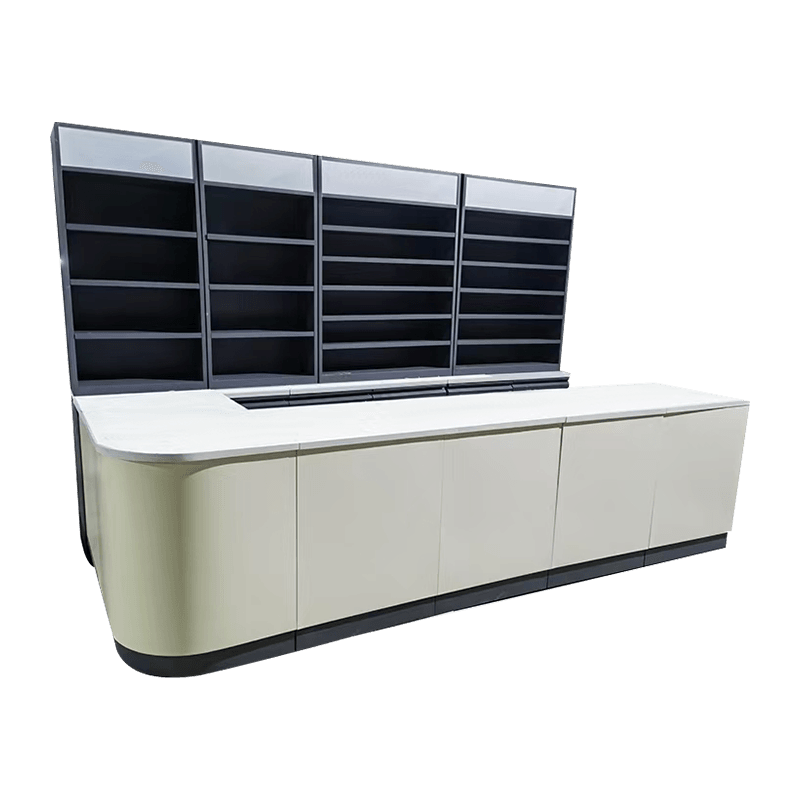 Design requintado, altamente ergonômico, fazendo com que os clientes se sintam confortáveis e convenientes na finalização da compra. A bancada é espaçosa e plana, tornando conveniente para os caixas digitalizar códigos e liquidar contas rapidamente, bem como para os clientes colocarem pequenos itens que compram temporariamente, como chicletes, balas de menta e outros bens de consumo impulsivo.